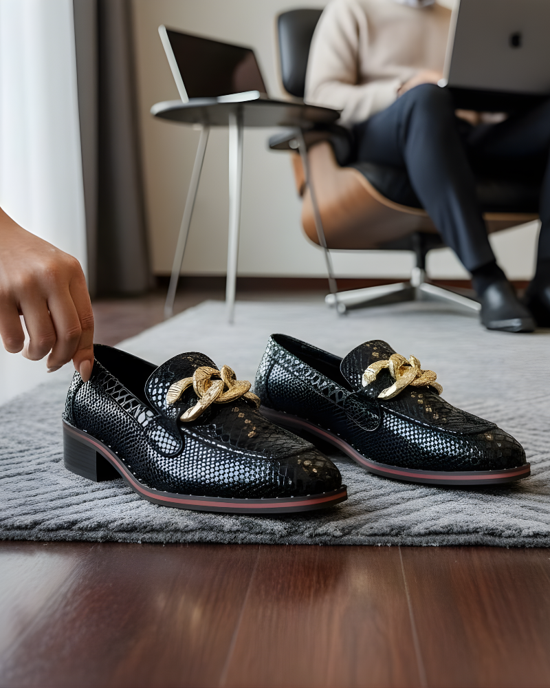 Step into timeless elegance with Black Billion Carlo Black Designer Cuban Heel Loafer With Golden Buckle. Designed with a sleek silhouette Tunit (sheet) Silver pins sole and premium craftsmanship, celebrity choice boot offer a perfect balance of sophistication and comfort. Ideal for Party wear, Clubbing meetings, and Special occasions, they deliver a sharp look with effortless convenience.
